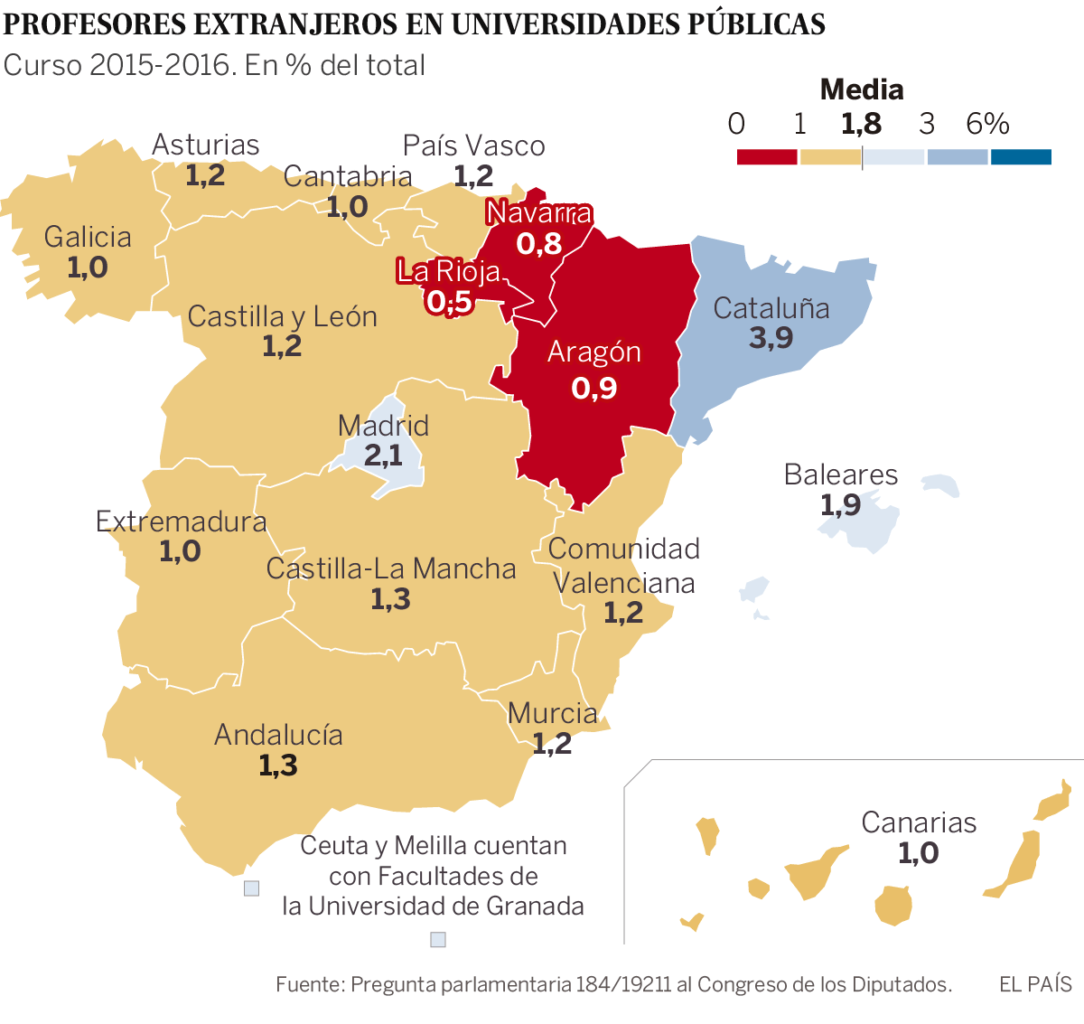 No todos los campus españoles funcionan igual. Hay diferencias notables entre la autonomía mejor situada, Cataluña (3,9%), la única que está por encima de la media española y la peor, La Rioja (0,5). Y la brecha es aún más amplia entre el campus que mejor sale en el mapa —la Pompeu Fabra (UPF) de Barcelona, con 12,1%— y la Universidad de Jaén, con apenas un 0,3% de docentes extranjeros en datos de 2015-2016, facilitados por el Gobierno en una respuesta parlamentaria reciente. Una de las claves de la UPF es que prohíben contratar docentes formados en sus centros. En la Universidad de Jaén, que ha mejorado sus datos en los últimos dos cursos, explican que la normativa y la burocracia no ayudan y añaden que son un campus pequeño y del interior.