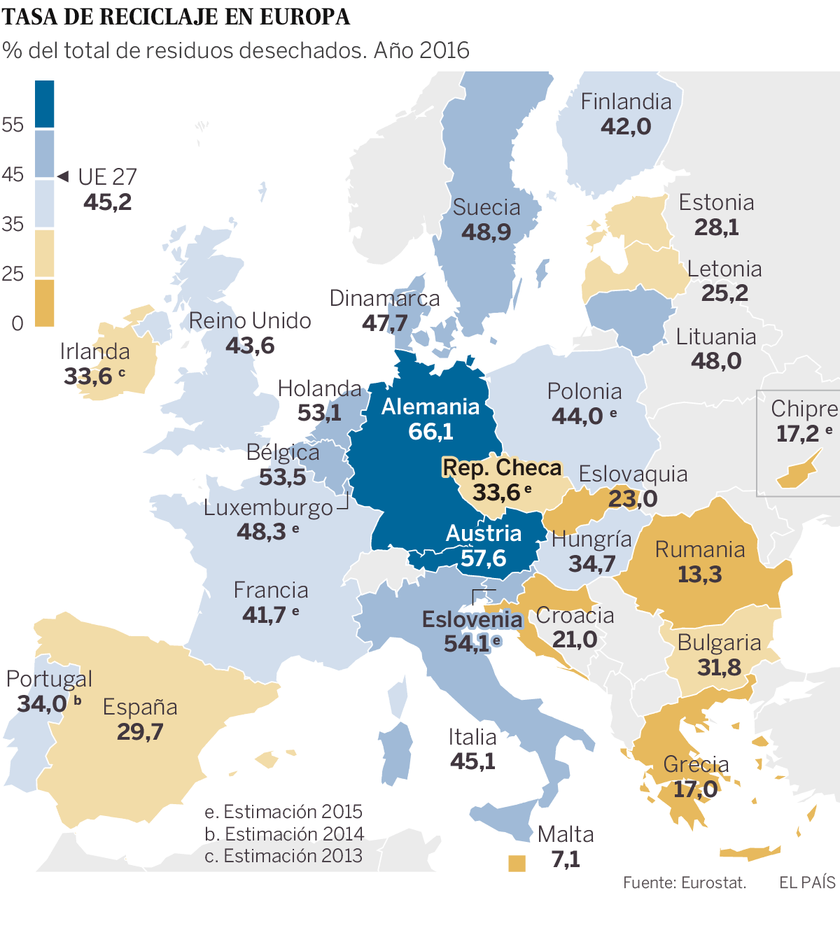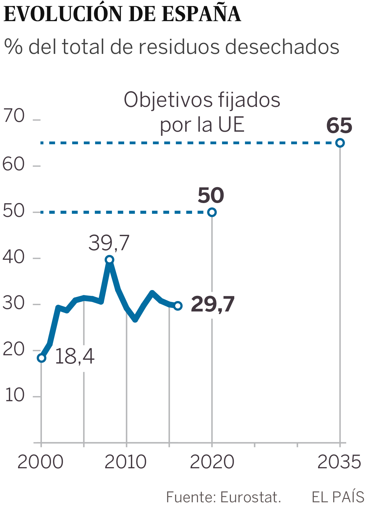 Alrededor del 45% de los residuos municipales (los desechos urbanos, que no incluyen ni los industriales ni los peligrosos) que se generan en este momento en el conjunto de la UE se recicla, según los últimos datos de Eurostat, la Oficina Europea de Estadística. La directiva vigente de residuos establece que en 2020 cada Estado debe llegar a una tasa de reciclaje del 50%, con lo que la UE en su conjunto estaría a solo cinco puntos de cumplir. Además, los nuevos objetivos que habrá para 2025 y 2035 son relativamente asequibles, ya que supondrán un aumento anual de solo un punto para cumplir con la hoja de ruta prevista.