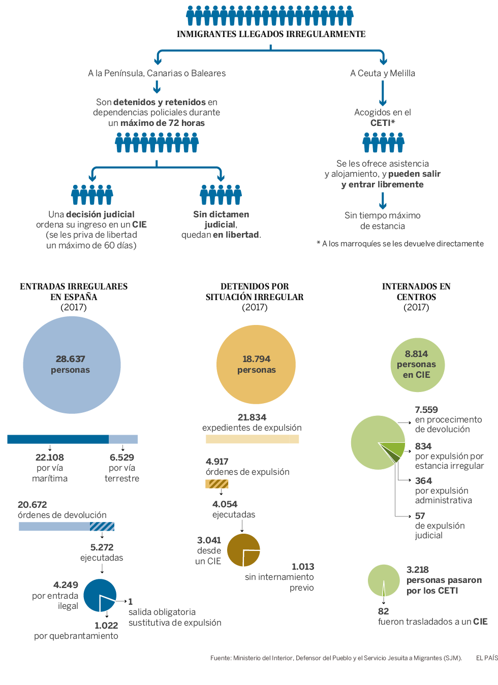 Los datos recabados por el Defensor del Pueblo en uno de sus últimos informe señalan que España ordenó echar en 2017 a cerca de 20.000 inmigrantes de los 28.637 interceptados en las fronteras cuando trataban de acceder al país de forma irregular. El Gobierno ejecutó finalmente la devolución de 5.272, que representan el 18% del total. Además, al 34% de los llegados en patera se les recluyó en un Centro de Internamiento de Extranjeros (CIE), donde quedan privados de libertad durante un periodo máximo de dos meses.
