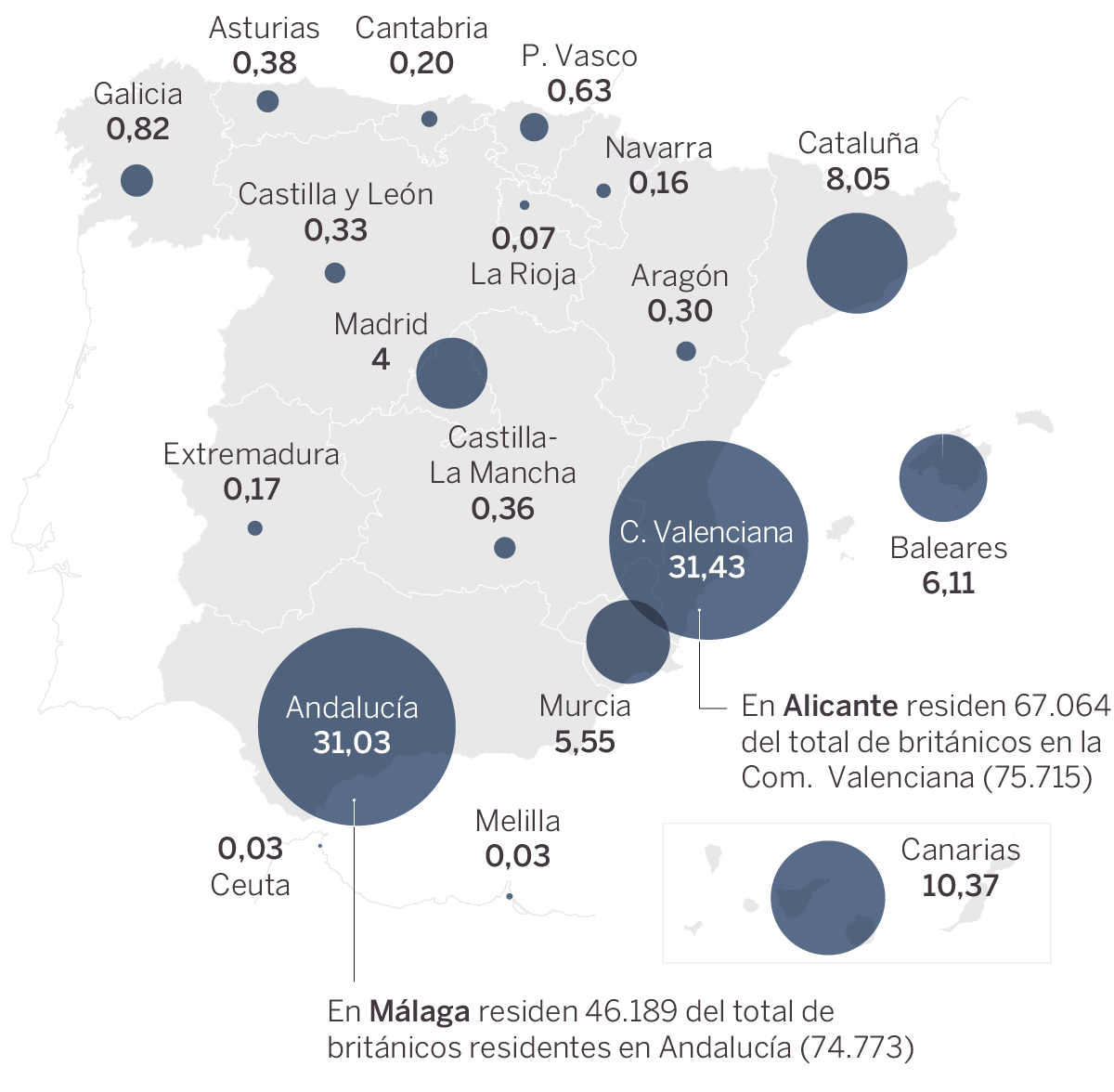 En España viven más de 280.000 ciudadanos del Reino Unido, la colonia más numerosa de expatriados británicos en un país de la UE. Y la segunda más nutrida de nacionales de un país europeo que hay en España después de la rumana.
