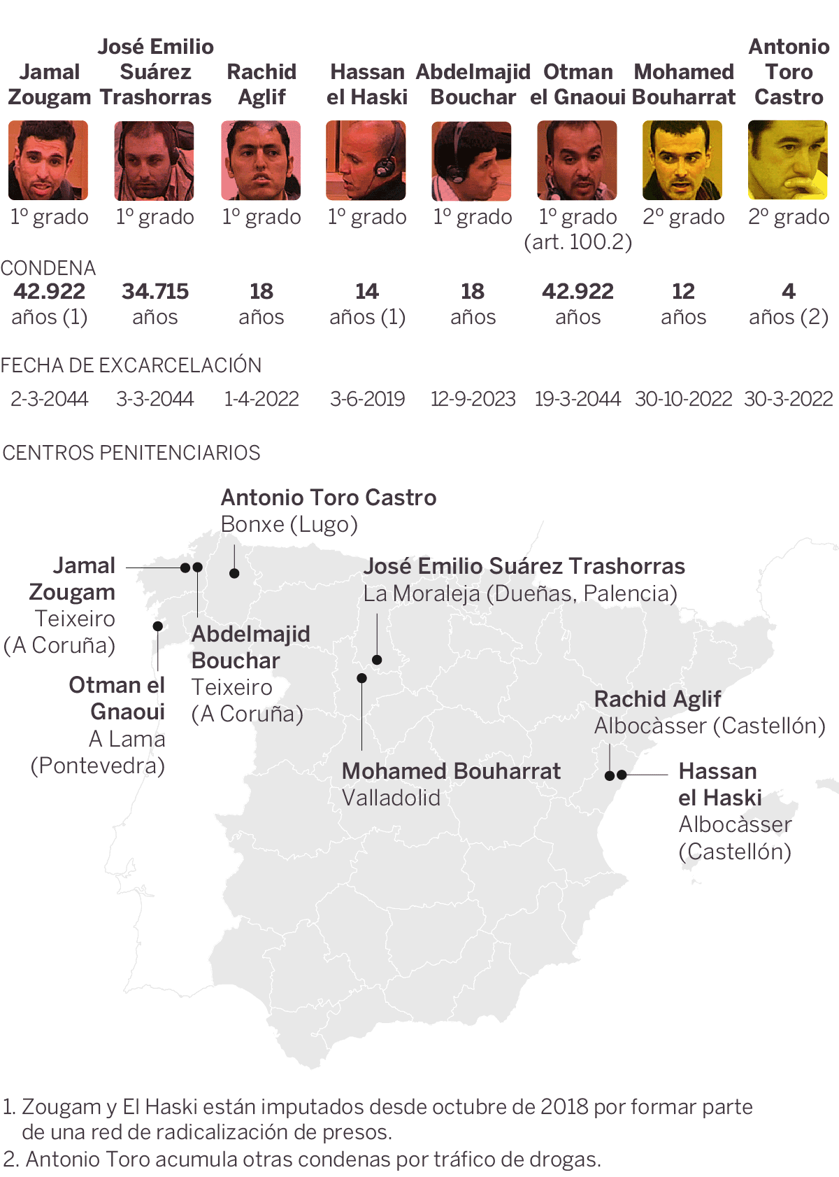 En esta nueva causa también es investigado Zougam, el otro condenado como autor material de los atentados. Recluido en la prisión de Teixeiro (A Coruña), la pena de 42.922 años le mantendrá en prisión hasta el 2 de marzo de 2044. En la misma prisión está Abdelmajid Bouchar, bautizado en su día por la policía como El Gamo tras escapar de una primera detención a la carrera. Bouchar fue condenado a 18 años de cárcel y su excarcelación está prevista para el 12 de septiembre de 2023. La misma pena se le impuso a Rachid Aglif, El Conejo, recluido en el Centro Penitenciario de Albocàsser (Castellón), la misma que El Haski. Su salida de prisión está prevista para el 1 de abril de 2022.