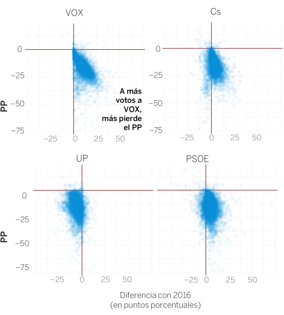 Relación entre la caída del PP y el voto a otros partidos