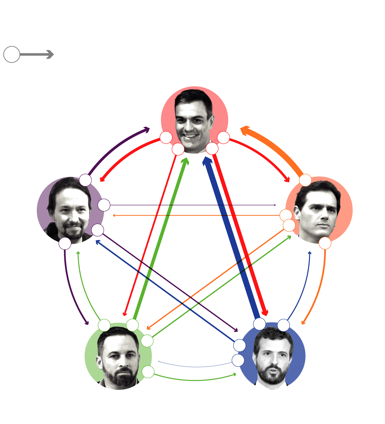 Entre los "socios preferentes" de la derecha, el líder de Ciudadanos interpeló más a Casado (siete veces) que viceversa. Vox, no obstante, repartió sus reproches a partes iguales: cuatro al presidente del PP, cinco a Rivera. Los representantes de los tres partidos se centraron en atacar a Pedro Sánchez: 24 veces le interpelaron los líderes del PP y Ciudadanos, y 14 Abascal.