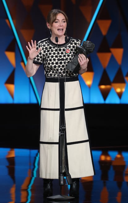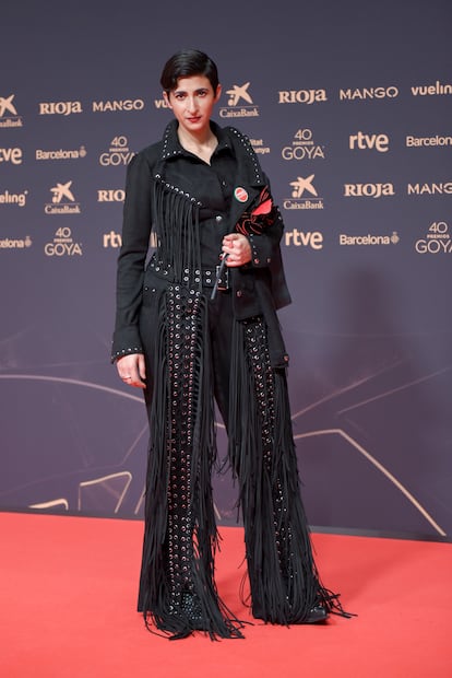 Leonor Watling, presentadora de la ceremonia el año pasado, con un vestido en crepé negro y rojo de Sybilla.Europa Press News (Europa Press via Getty Images)La futbolista azulgrana Alexia Putellas lució un vestido negro de la primera colección de Pierpaolo Piccioli para Balenciaga.Europa Press News (Europa Press via Getty Images)Susan Sarandon, premio Goya internacional en esta edición, acudió a la ceremonia celebrada en Barcelona con un diseño de Armani. Un vestido negro y azul marino con cuerpo inspirado en una chaqueta de esmoquin.JOSEP LAGO (AFP via Getty Images)Irene Escolar optó por el negro. Su vestido es una pieza de archivo de Giorgio Armani, de la colección otoño-invierno 2004, y lo combinó con joyas de Tiffany & Co. La intérprete ha triunfado en el teatro con la obra de Pablo Messiez 'Personas, lugares y cosas'.Europa Press News (Europa Press via Getty Images)Susana Abaitua, nominada como mejor actriz protagonista por 'Un fantasma en la batalla', con un diseño de Vivienne Westwood y joyas de Rabat.Pablo Cuadra (Getty Images)Mario Casas, nominado a mejor actor protagonista por 'Muy lejos', con esmoquin a medida de Mansolutely, zapatos de Christian Louboutin y joyas de Dinh Van.Europa Press News (Europa Press via Getty Images)Belén Rueda se decantó por el blanco y lució un diseño con sobrecapa de Valenzuela Atelier, su firma de cabecera para este tipo de eventos.JOSEP LAGO (AFP via Getty Images)Alba Flores, nominada por su película documental 'Flores para Antonio' apostó por un traje con flecos del diseñador alicantino Dominnico.