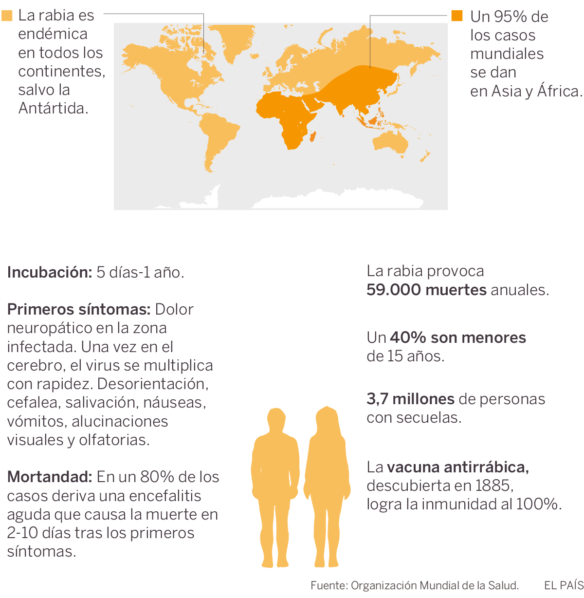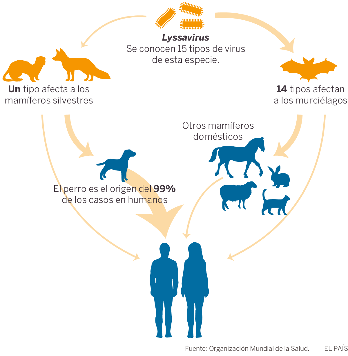 Los virus de la rabia forman una familia de una quincena de miembros que cursan lo que los investigadores denominan "dos ciclos". El llamado "urbano", causado por solo un virus, provoca unas 60.000 muertes al año en el mundo, casi siempre por mordeduras de perro en países en desarrollo. "El perro recibe el virus de algún animal silvestre y, si no ha sido vacunado, desarrolla la enfermedad. Cambia su comportamiento, se vuelve agresivo y transmite la rabia mordiendo a otros mamíferos de su entorno —gatos, caballos...— y también a los seres humanos", cuenta Rodríguez Ferri.