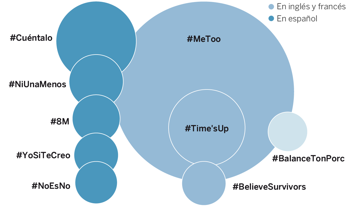 Del gráfico se extraen varias conclusiones. La primera es que salvo el #MeToo, —hashtag que supera el sumatorio de todas las demás—, la mayoría de etiquetas fueron flores de un día, relacionadas con eventos muy concretos. Los hashtags en inglés tienen tres grandes picos: a mediados de septiembre de 2017, cuando salta el escándalo Weinstein; el 7 y 8 de enero de 2018, durante la celebración de los Globos de Oro y desde mediados de septiembre hasta principios de octubre, durante la audiencia de Brett Kavanaugh ante la comisión del Senado de EE UU. En el mundo hispano, hay pequeños hitos durante las manifestaciones feministas del 25N (Día Internacional con la Violencia de Género), el 8M (Día de la Mujer) o el 4 de junio (por la legalización del aborto en Argentina), pero no son comparables al enorme pico que se dispara tras la publicación de la sentencia de La Manada el pasado 26 de abril.