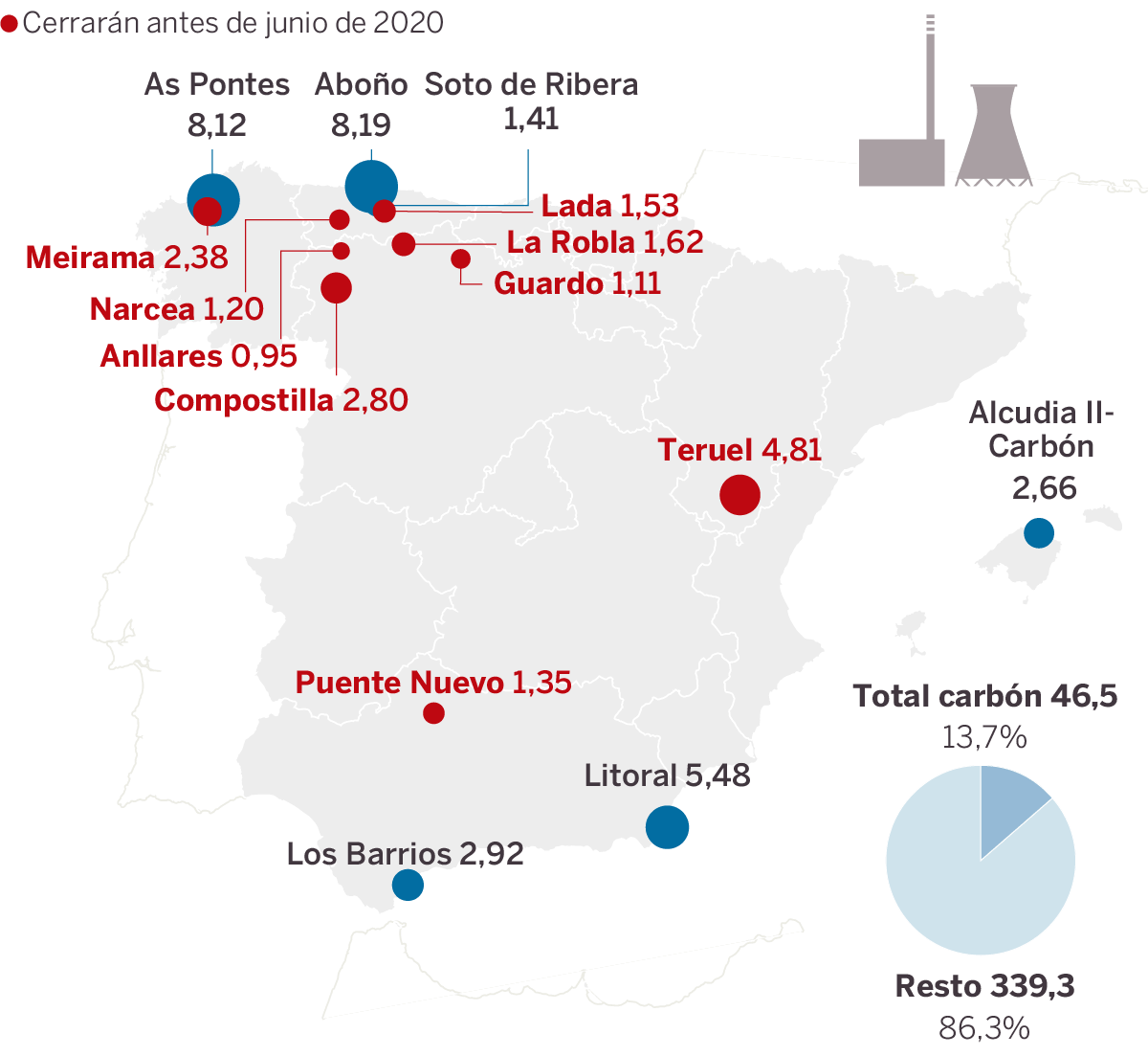 Todo esto hace que las centrales de carbón sean cada vez menos atractivas. De hecho, las eléctricas han emprendido una carrera en España por deshacerse de unas plantas viejas que necesitan de costosas obras si quieren seguir operando. De las 15 centrales que queman carbón que hay ahora en España –y que este 2018 han generado el 14% de la electricidad del país– nueve cerrarán en el próximo año y medio. Al menos, es lo que quieren sus propietarias. Iberdrola y Endesa ya han presentado al Gobierno la petición para clausurar cuatro de sus plantas. Naturgy –antigua Gas Natural– presentará en breve la misma petición para otras tres de sus centrales. Y sin plantas térmicas el futuro de la minería, que ya estaba trazado desde principios de esta década, es aún más negro.