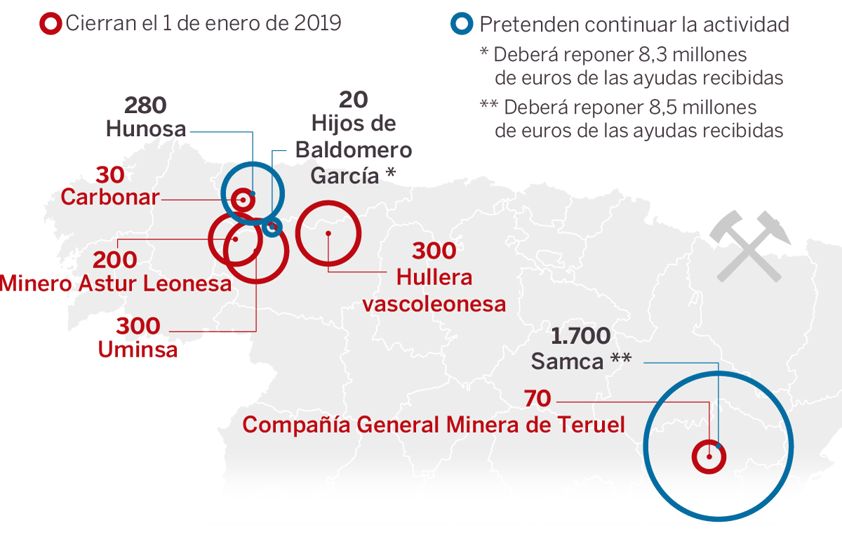 Solo dos compañías mineras han mostrado interés ante el ministerio por seguir operando. Hijos de Baldomero García –empresa de El Bierzo (León), que cuenta con unos 25 empleados– y Samca –compañía turolense que tiene unos 150 trabajadores–. Al margen de estas dos privadas, la sociedad pública Hunosa (que tiene un millar de mineros aún en Asturias) sostiene que seguirá operando un pequeño pozo que no ha recibido ayudas públicas.