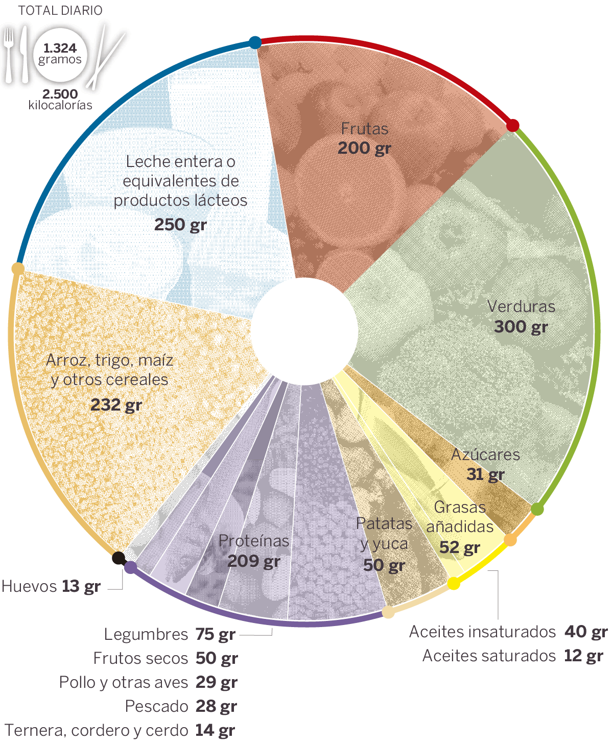 Aunque exista una “brecha dietética” en función del país y del área geográfica —en Indonesia y África occidental, por ejemplo, se consumen cantidades muy reducidas de carne y lácteos, a diferencia de en Norteamérica—, el informe de los expertos detecta que de media en el mundo la ingesta de carne roja, vegetales almidonados —como la patata— ricos en hidratos y huevos es demasiado alta. La comisión plantea una dieta ideal —basada en 2.500 kilocalorías diarias— y sugiere que solo 30 de ellas procedan de carnes distintas de las aves, lo que equivaldría, por ejemplo, a consumir una hamburguesa de ternera pequeña a la semana. El objetivo global es doblar el consumo de frutas, hortalizas, legumbres y frutos secos, y reducir a la mitad el de carne roja y el azúcar. Actualmente, y fundamentalmente en Occidente, el consumo de carne roja y de alimentos procesados y refinados es excesivo, lo que acarrea riesgos para la salud mayores que los causados por el sexo no seguro, el alcohol, la droga y el tabaco juntos, detalla el informe.