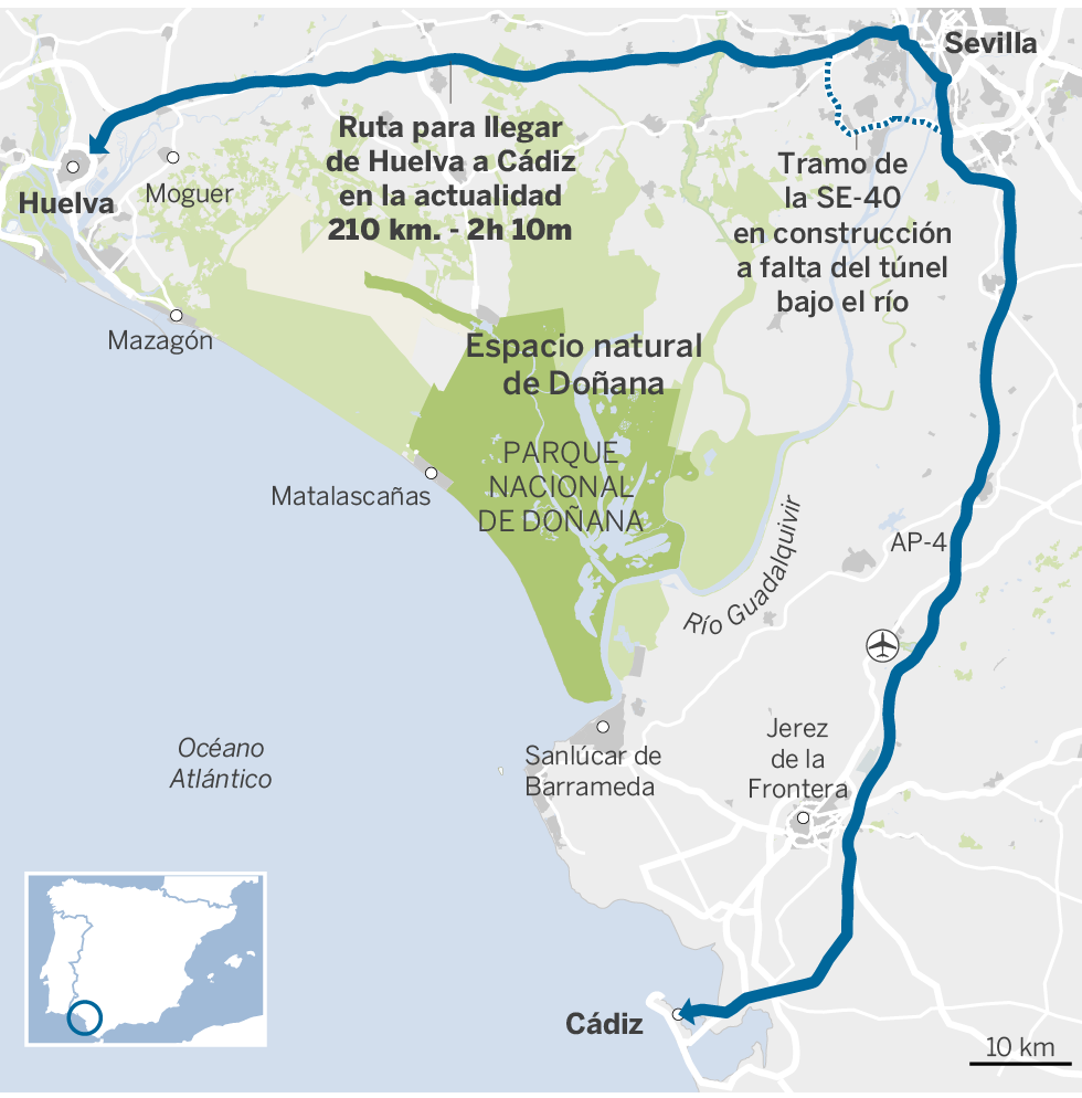 “Es un proyecto zombi”, resume Carmona, de WWF, quien resalta las complicaciones medioambientales —cualquier proyecto en la comarca despierta el interés de la Comisión Europea y de la Unesco—. Habla también de la “inmensa” inversión que se necesitaría. “Y solo se ahorrarían unos diez minutos cuando la S-40 esté terminada”, sostiene Carmona. El proyecto que ha defendido hasta ahora el PP supondría construir otro túnel o puente para salvar el Guadalquivir a solo diez kilómetros del proyectado desde 2009 para la S-40 en el municipio sevillano de Coria del Río.