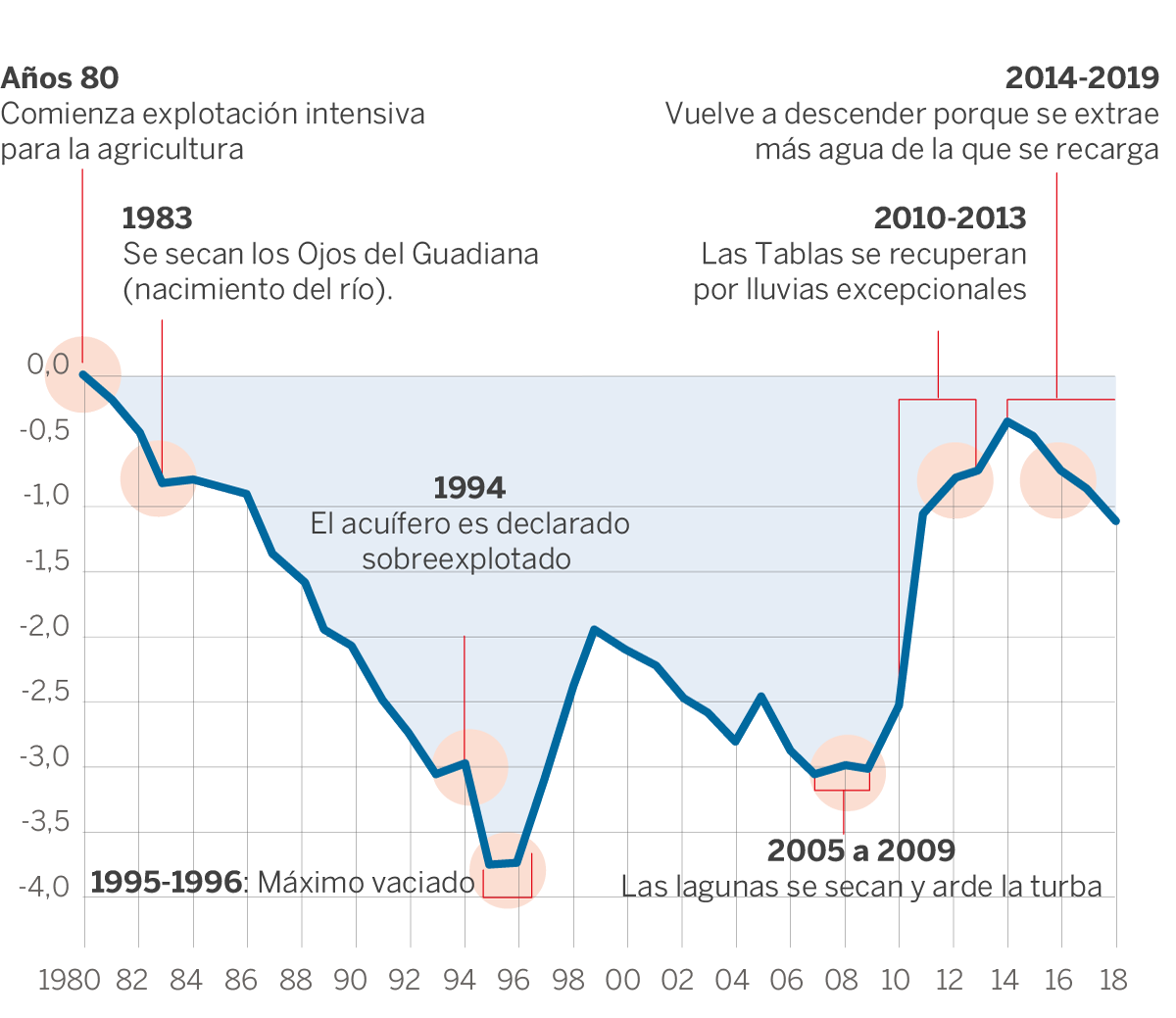 Esta tendencia amenaza con convertir en un espejismo la segunda e inesperada oportunidad que ofrecieron al parque las excepcionales lluvias que se produjeron entre 2010 y 2013. El acuífero se recuperó, las lagunas se llenaron y Los Ojos del Guadiana (nacimiento del río) volvieron a surgir en 2012, con muy poco caudal, después de 30 años desaparecidos. Pero ahora, con la sequía, el acuífero pierde desde 2015, porque se saca más agua de la que se recarga, advierte Miguel Mejías, jefe de Área de Hidrogeología Aplicada del Instituto Geológico Minero de España (IGME).