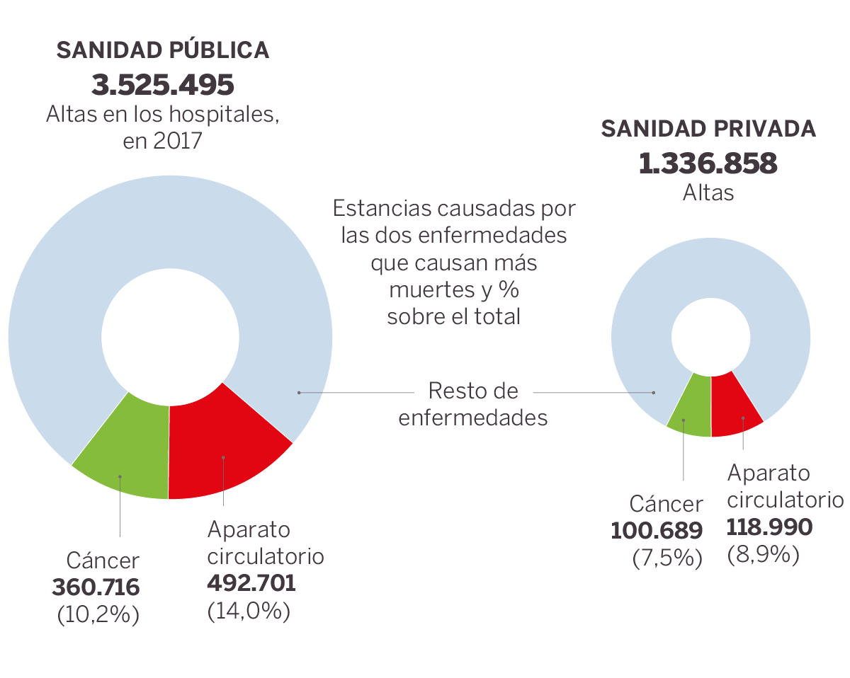 En concreto, las altas por ingresos cuya causa principal fueron los tumores suponen un 10,23% de las emitidas en la pública, frente a un 7,53% de la privada. Para las enfermedades cardiovasculares, la proporción es de 13,98% a 8,90%. Si se suma la tercera causa más frecuente de muerte, las enfermedades respiratorias, la proporción es de 37% a 26%. En resumen, los hospitales públicos dedican un tercio de su esfuerzo a los tres grupos de enfermedades más graves (que causan más defunciones), y los centros privados, un cuarto.