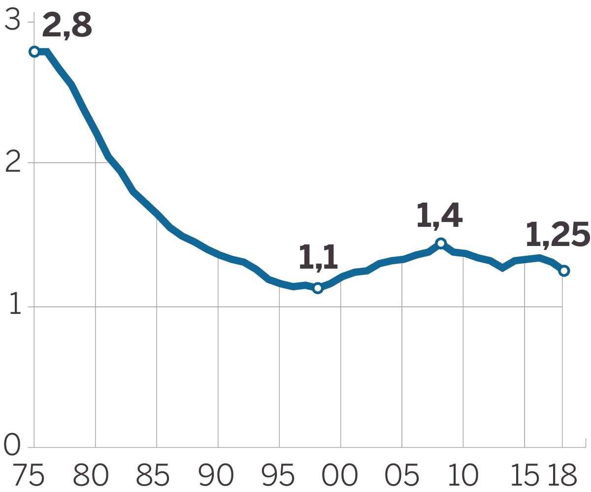 Su preocupación radica en que ahora las mujeres tienen 1,25 hijos de media, frente a los 1,44 de hace una década —es la cifra más baja desde 2002—. En que el más de medio millón de nacimientos de hace una década se haya reducido a menos de 370.000 el año pasado (28,95%), nunca más bajo desde 1998. En que el primer hijo se haya retrasado a los 31 años, en lugar de a los 29,30 de hace una década. Mientras, la esperanza de vida al nacer galopa hasta los 83,2 años —80,5 para los hombres y 85,9 para las mujeres—.