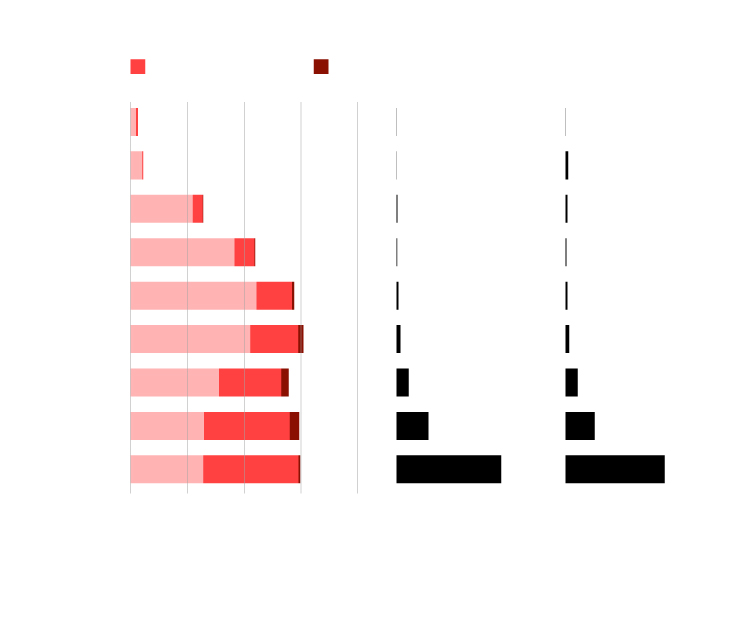 El grueso de estos casos se distribuyen bastante uniformemente, en torno a los 3.000 afectados, en cada una de las décadas a partir de los 40 años. Los datos muestran claramente la diferente gravedad con la que cursa la enfermedad según la edad. Así, los pacientes a partir de los 60 años suponen el 67,8% del total de los hospitalizados por coronavirus en España y el 68,4% de los ingresos en la UCI. Si se mira a partir de los 70, estos suponen el 49,7% de las hospitalizaciones, el 41,1% de los que necesitan cuidados intensivos y el 87,6% de los fallecidos.
