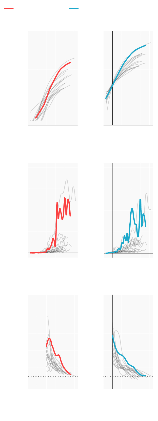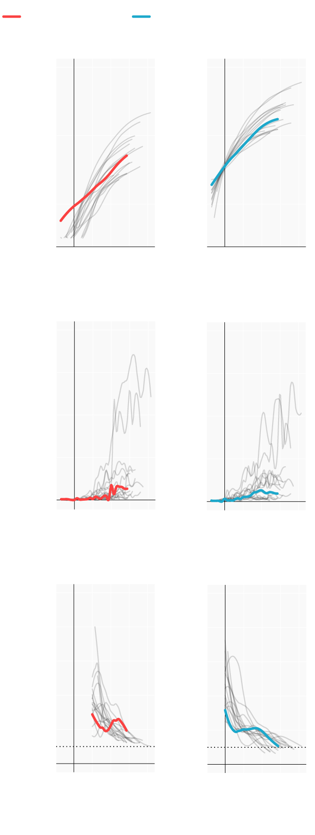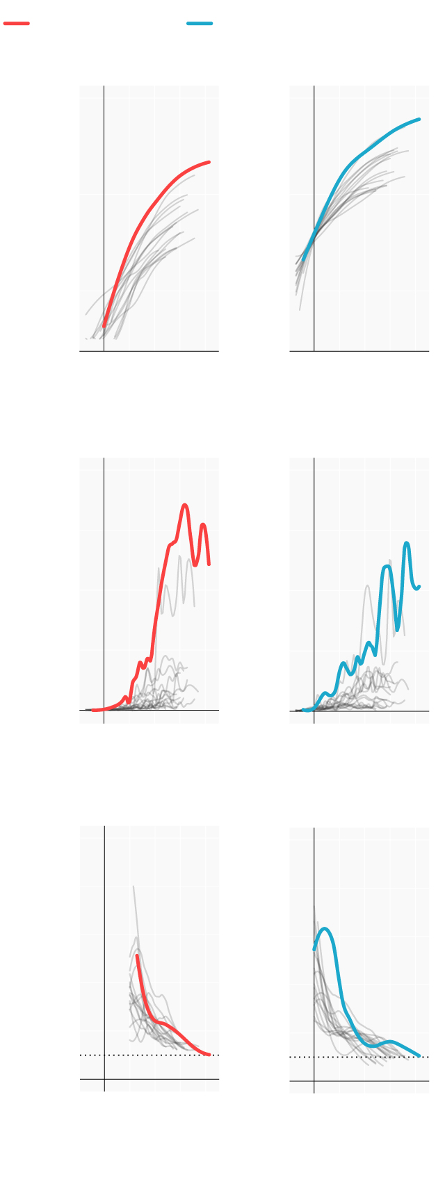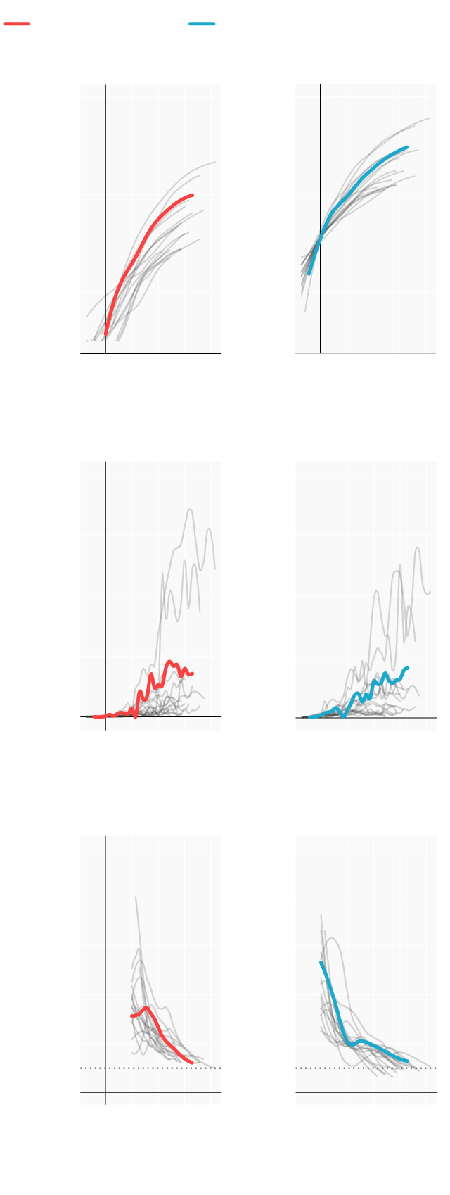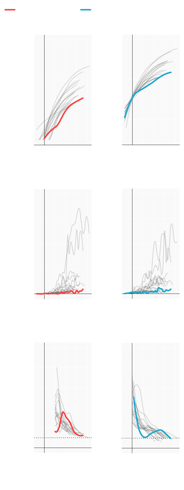 Repasamos la situación en los lugares donde se originaron los primeros brotes; en las comunidades que se han convertido en un foco más tarde y en las que, por el momento, se registran menos casos. Mostramos para ello cómo han evolucionado las muertes y los casos confirmados desde que se declararon los 100 primeros casos. En términos absolutos e incrementos diarios. También el número reproductivo (R), el número medio de contagios que produce cada infectado. Cuando este número es menor de 1 la epidemia comienza a remitir.