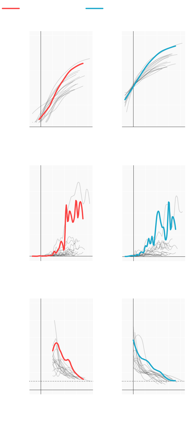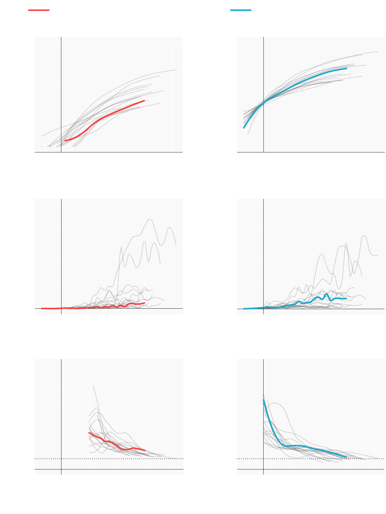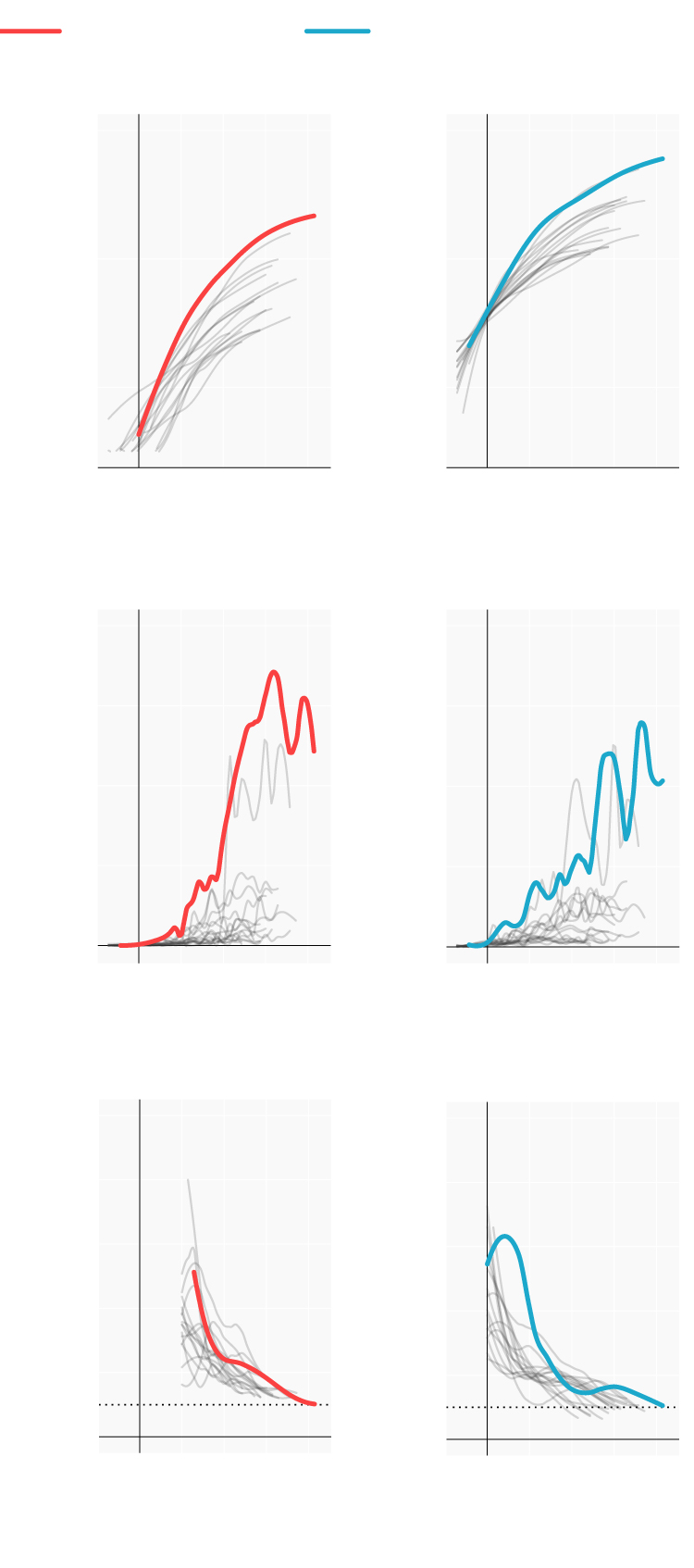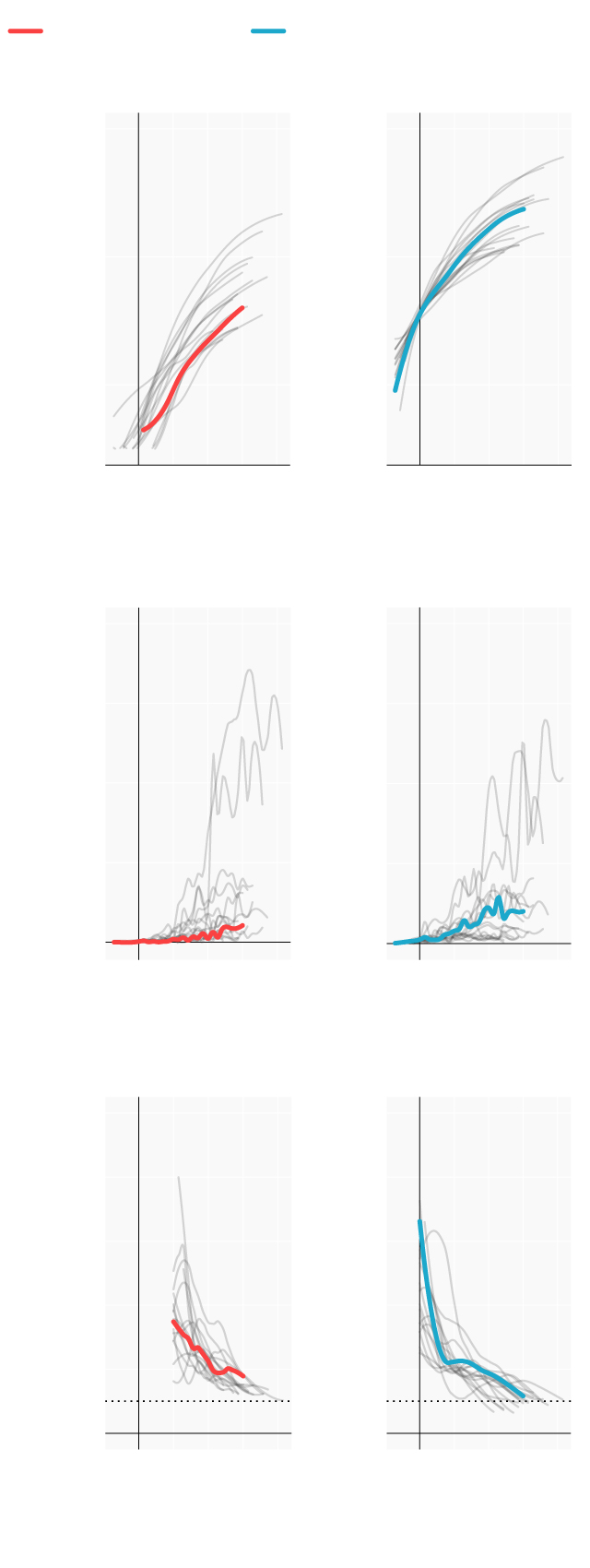 Repasamos la situación en los lugares donde se originaron los primeros brotes; en las comunidades que se han convertido en un foco más tarde y en las que, por el momento, se registran menos casos. Mostramos para ello cómo han evolucionado las muertes y los casos confirmados desde que se declararon los 100 primeros casos. En términos absolutos e incrementos diarios. También el número reproductivo (R), el número medio de contagios que produce cada infectado. Cuando este número es menor de 1 la epidemia comienza a remitir.