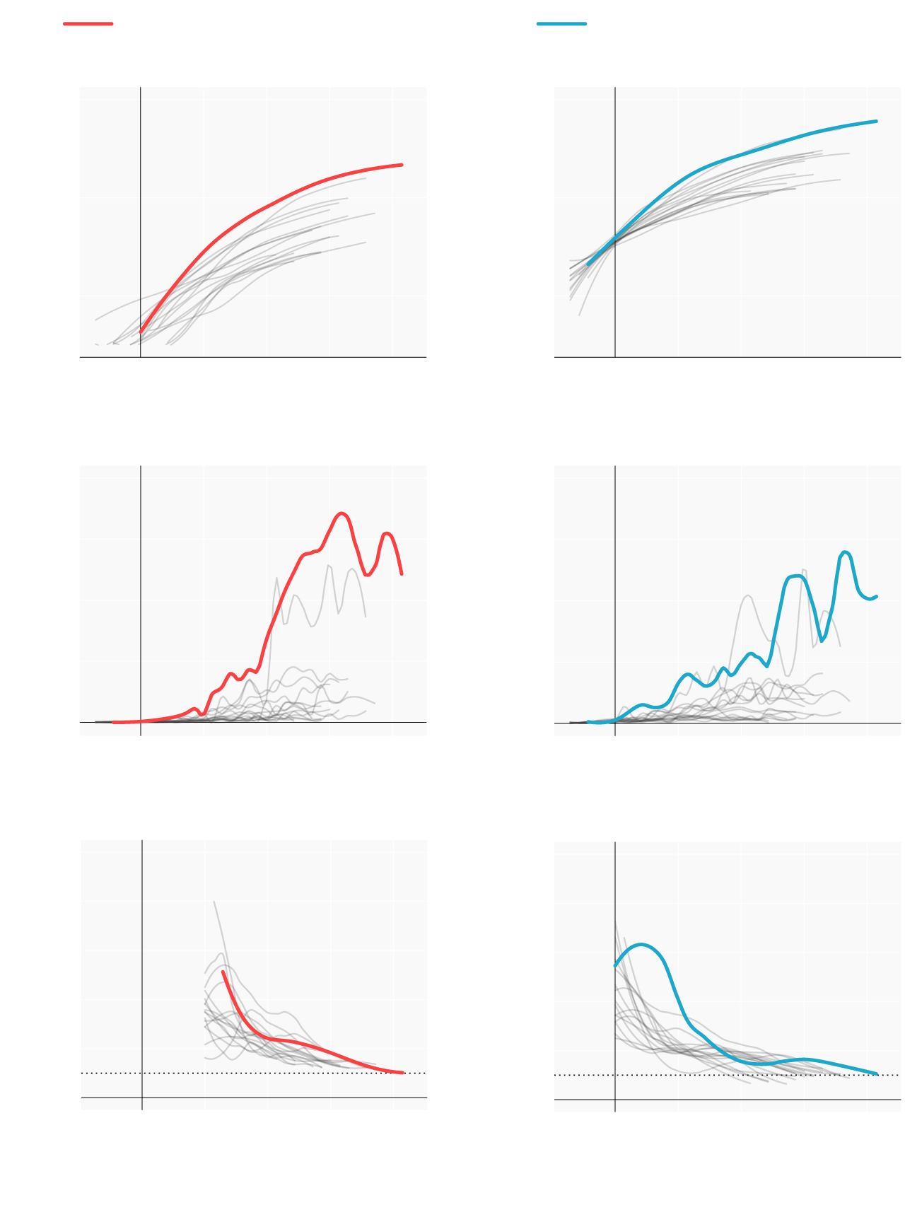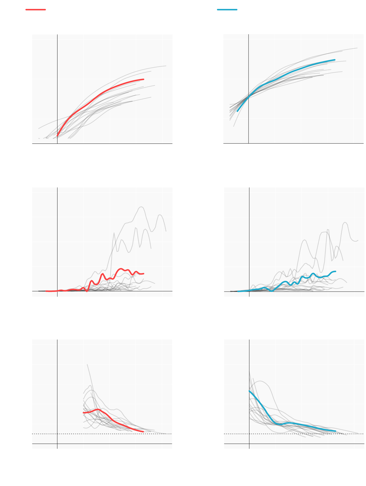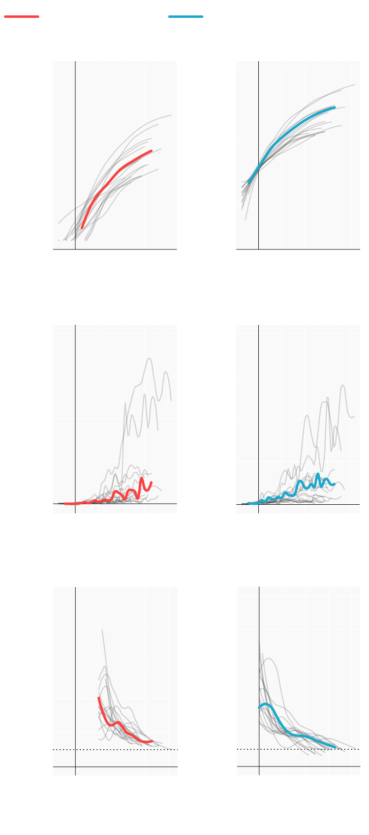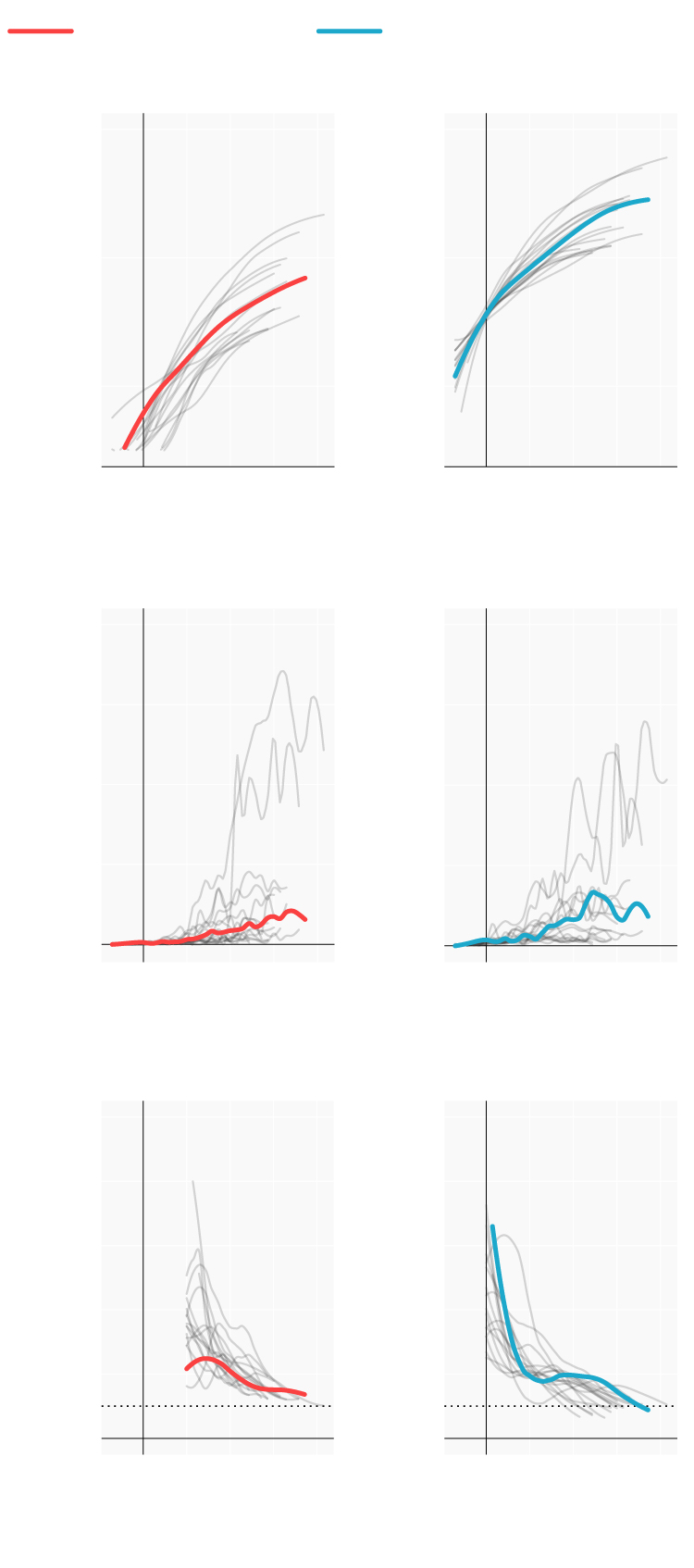 Repasamos la situación en los lugares donde se originaron los primeros brotes; en las comunidades que se han convertido en un foco más tarde y en las que, por el momento, se registran menos casos. Mostramos para ello cómo han evolucionado las muertes y los casos confirmados desde que se declararon los 100 primeros casos. En términos absolutos e incrementos diarios. También el número reproductivo (R), el número medio de contagios que produce cada infectado. Cuando este número es menor de 1 la epidemia comienza a remitir.