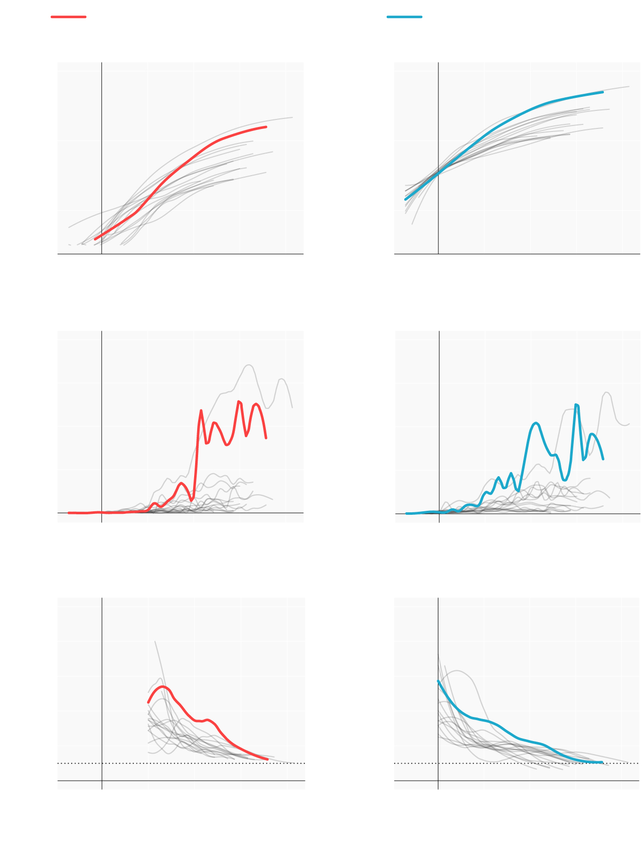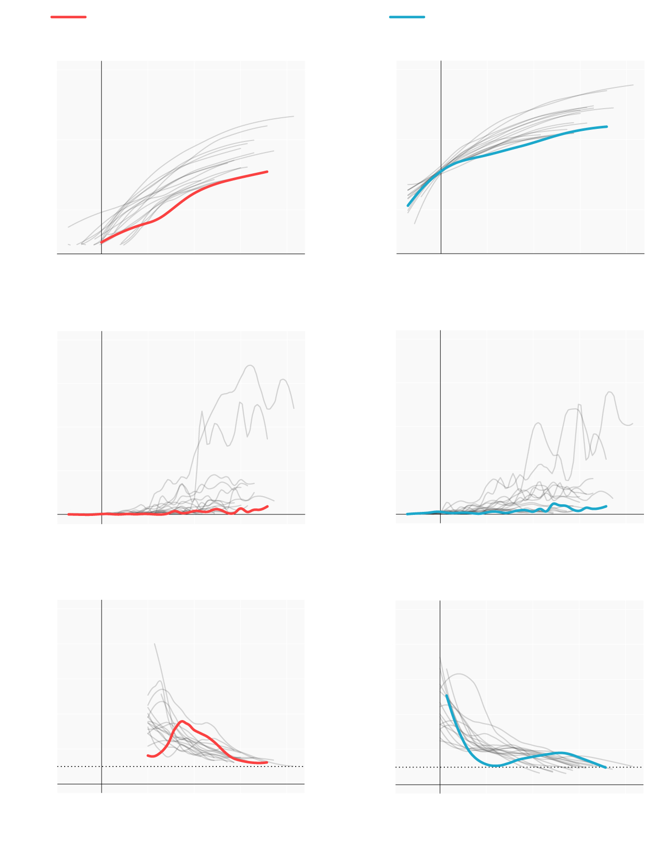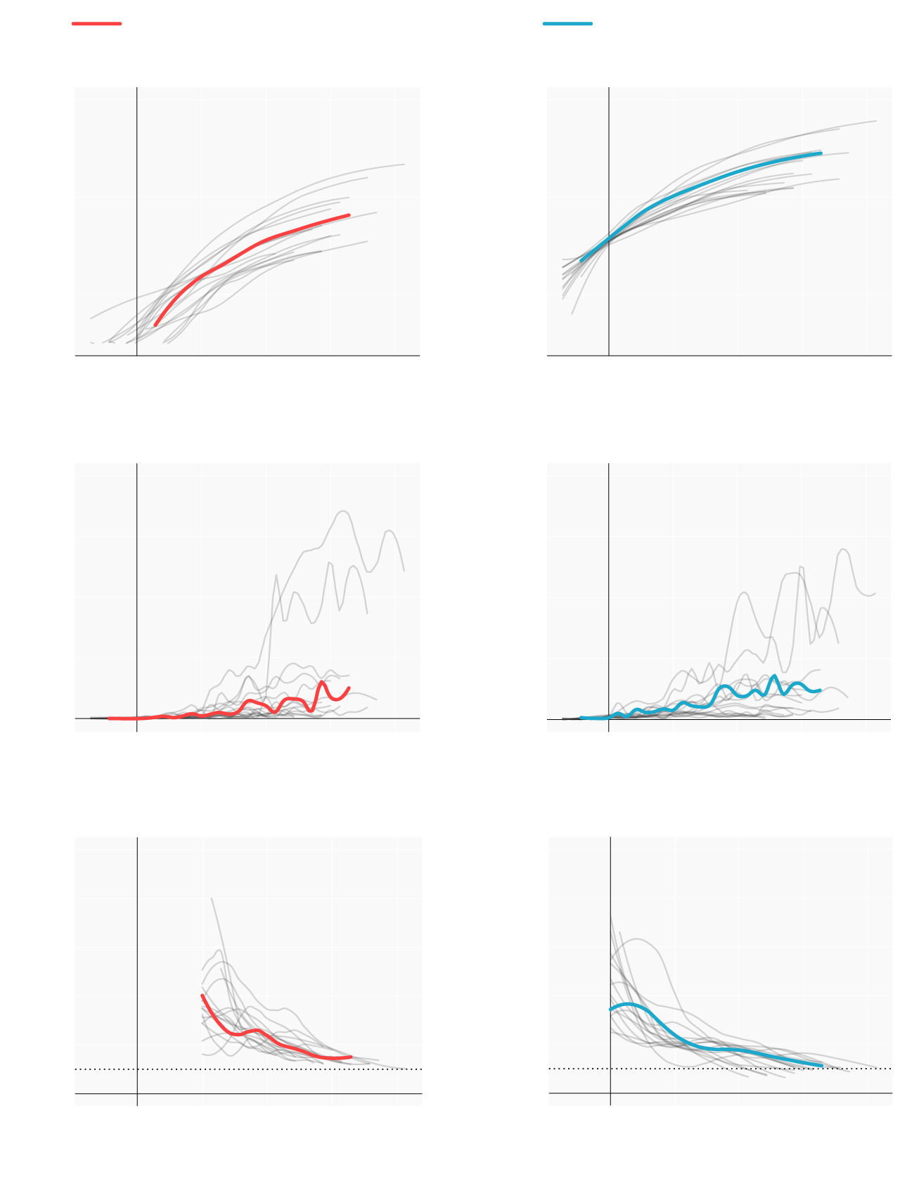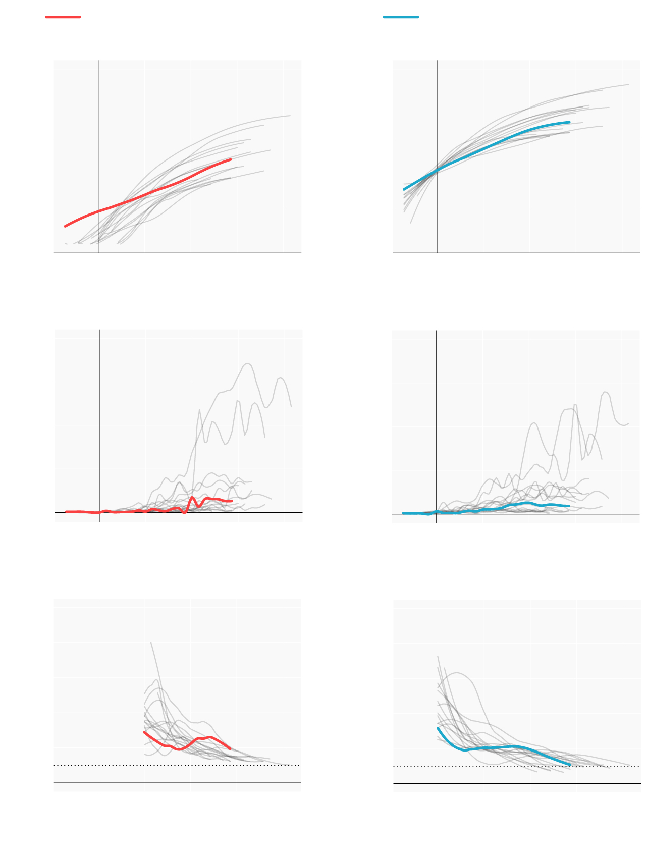Repasamos la situación en los lugares donde se originaron los primeros brotes; en las comunidades que se han convertido en un foco más tarde y en las que, por el momento, se registran menos casos. Mostramos para ello cómo han evolucionado las muertes y los casos confirmados desde que se declararon los 100 primeros casos. En términos absolutos e incrementos diarios. También el número reproductivo (R), el número medio de contagios que produce cada infectado. Cuando este número es menor de 1 la epidemia comienza a remitir.
