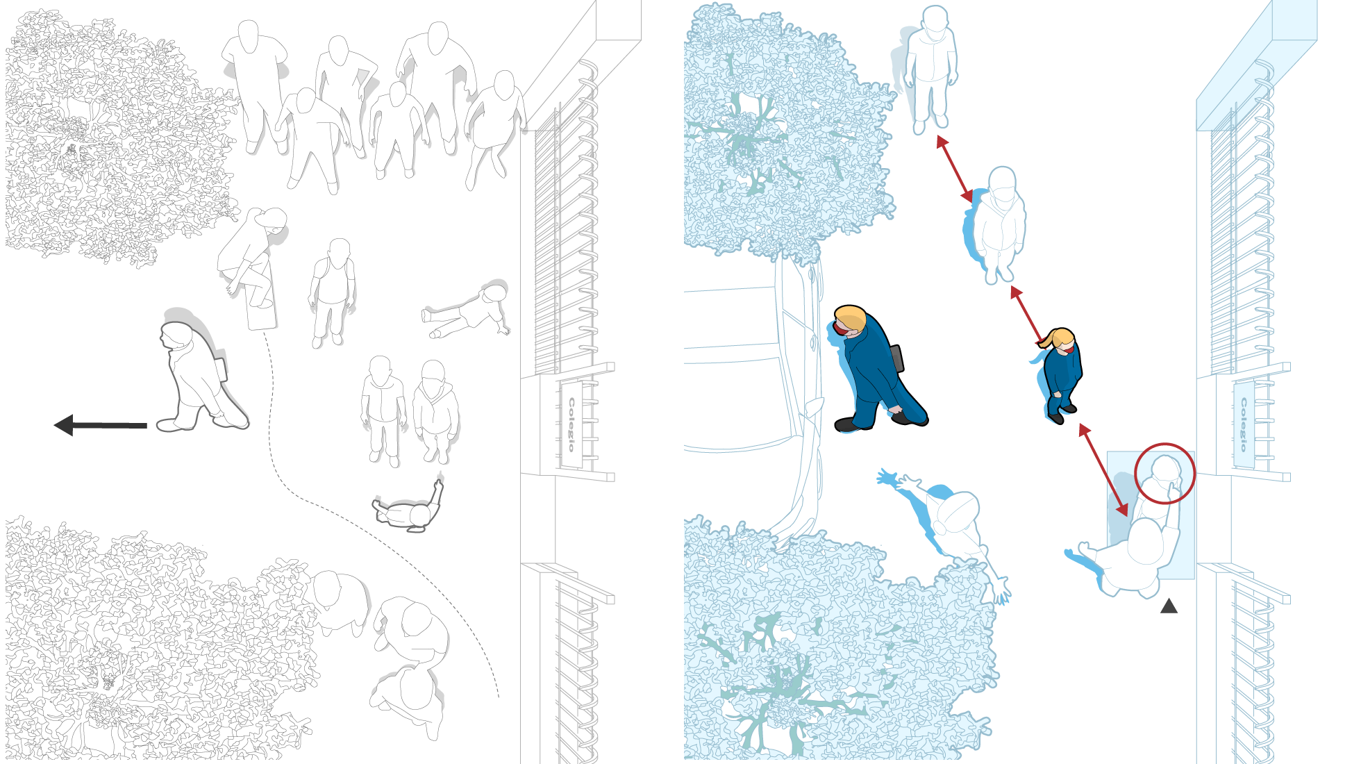 ENTRADA EN EL COLEGIO Y TRANSPORTE. Niños arremolinados y padres charlando era la estampa característica de la entrada a un centro escolar hace un año. Ahora, cada grupo familiar aguarda en una fila, separado del resto por 1,5 metros de distancia. Los niños entran de uno en uno, se desinfectan los zapatos y un responsable del colegio les toma la temperatura. Una vez que los padres han dejado a sus hijos en la escuela, prefieren tomar el coche si tienen que dirigirse al trabajo. El transporte público ha experimentado una caída de entre un 40% y un 50% en 2020, mientras que los desplazamientos en coche lo han hecho entre un 15% y un 20%.
