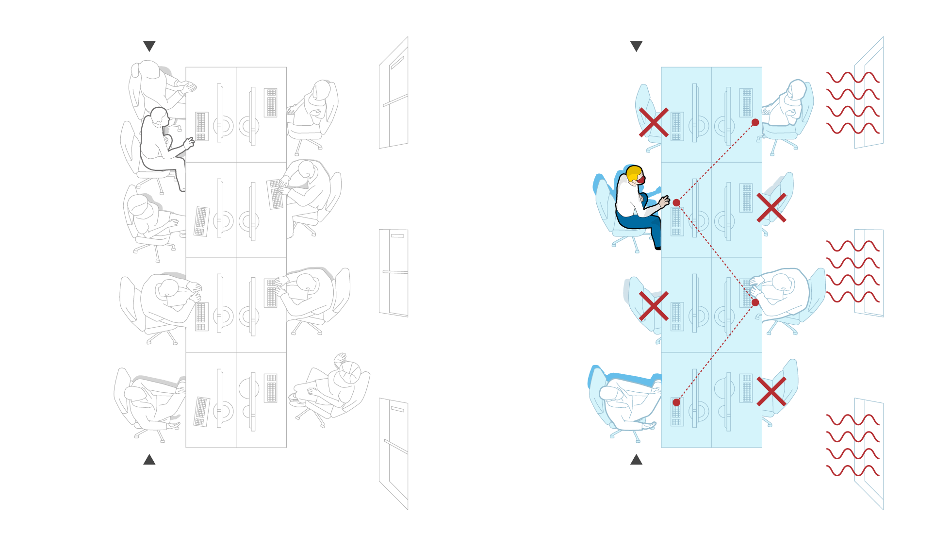 EN EL TRABAJO. La distancia social se ha impuesto en los centros de trabajo, donde ahora es muy habitual encontrar asientos alternos vacíos, para guardar una distancia de al menos 1,5 metros. También han desaparecido las comidas grupales —sustituidas por almuerzos individuales en la propia mesa—, se han reducido las reuniones y fomentado las videoconferencias y se han extremado las medidas de limpieza, cumpliendo con las recomendaciones ofrecidas por el Ministerio de Sanidad en la guía de Buenas prácticas en los centros de trabajo. De acuerdo con estos consejos, las empresas también deben facilitar todos las medidas de protección que sean necesarias para los trabajadores que desempeñan su función de cara al público.